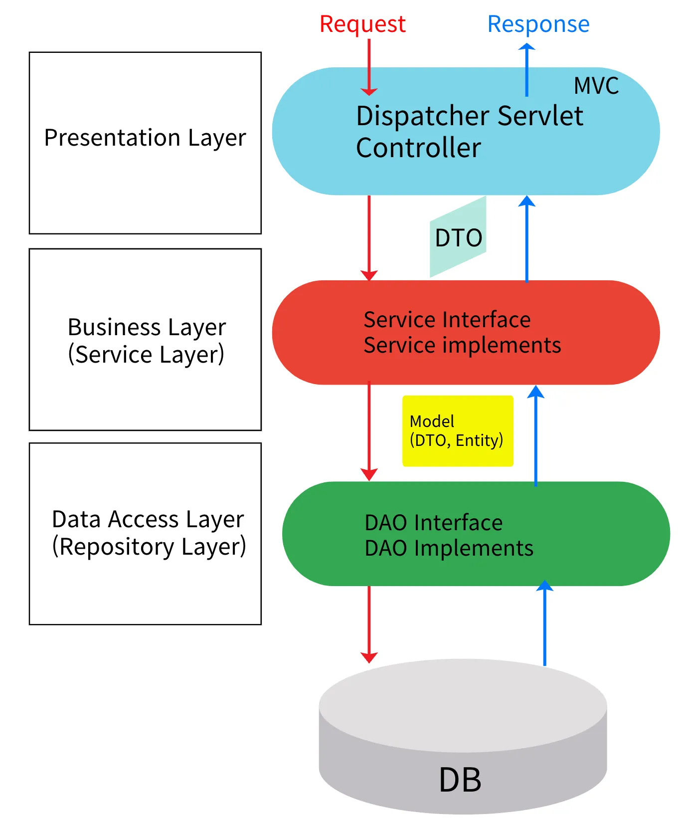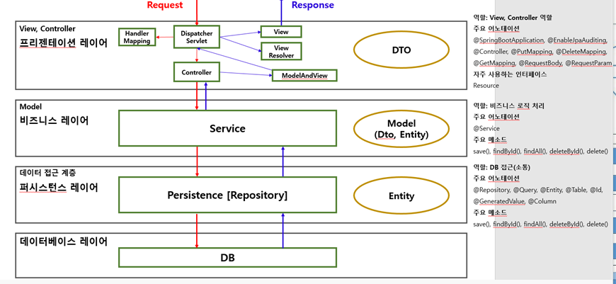 Client에서 요청(request)이 들어오면 먼저 Presentation Layer에서 DispatcherServlet이 HandelerMapping(적합한 Controller을 선택함)을 통해 Controller에게 Client요청을 해석하여 무엇인지 알리고, Controller은 Client 요청 처리를 Business Layer 에게 요구한다.