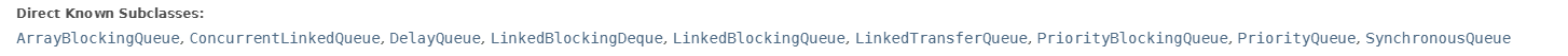 ArrayBlockingQueue, ConcurrentLinkedQueue, DelayQueue, LinkedBlockingDeque, LinkedBlockingQueue, LinkedTransferQueue, PriorityBlockingQueue, PriorityQueue, SynchronousQueue