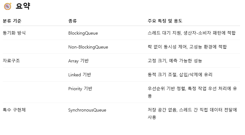 즉, BlockingQueue 인터페이스를 구현한 클래스들은 멀티스레드 환경에서 안전하게 작동하도록 설계되었음.