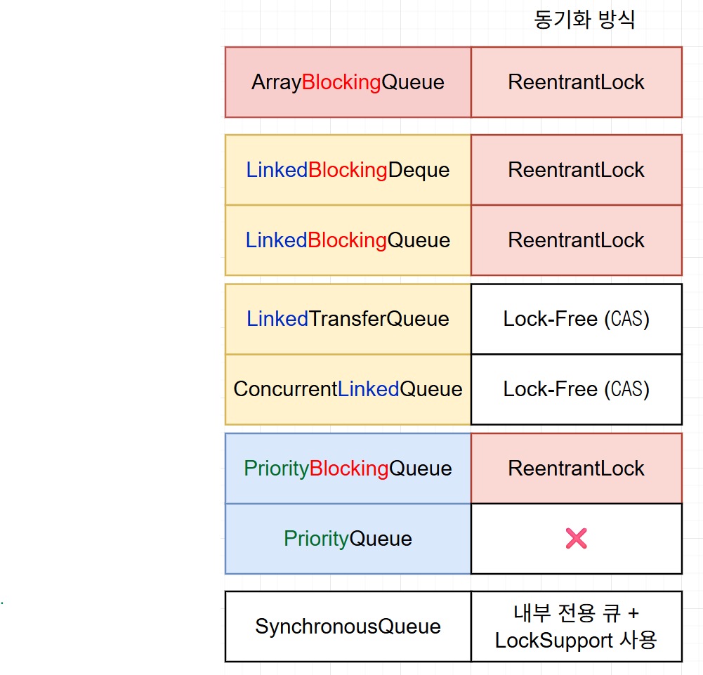 BlockingQueue는 ReentrantLock라는 동기화 방식을, 그 외에는 구현체마다 각각의 동기화 방식을 사용한다.