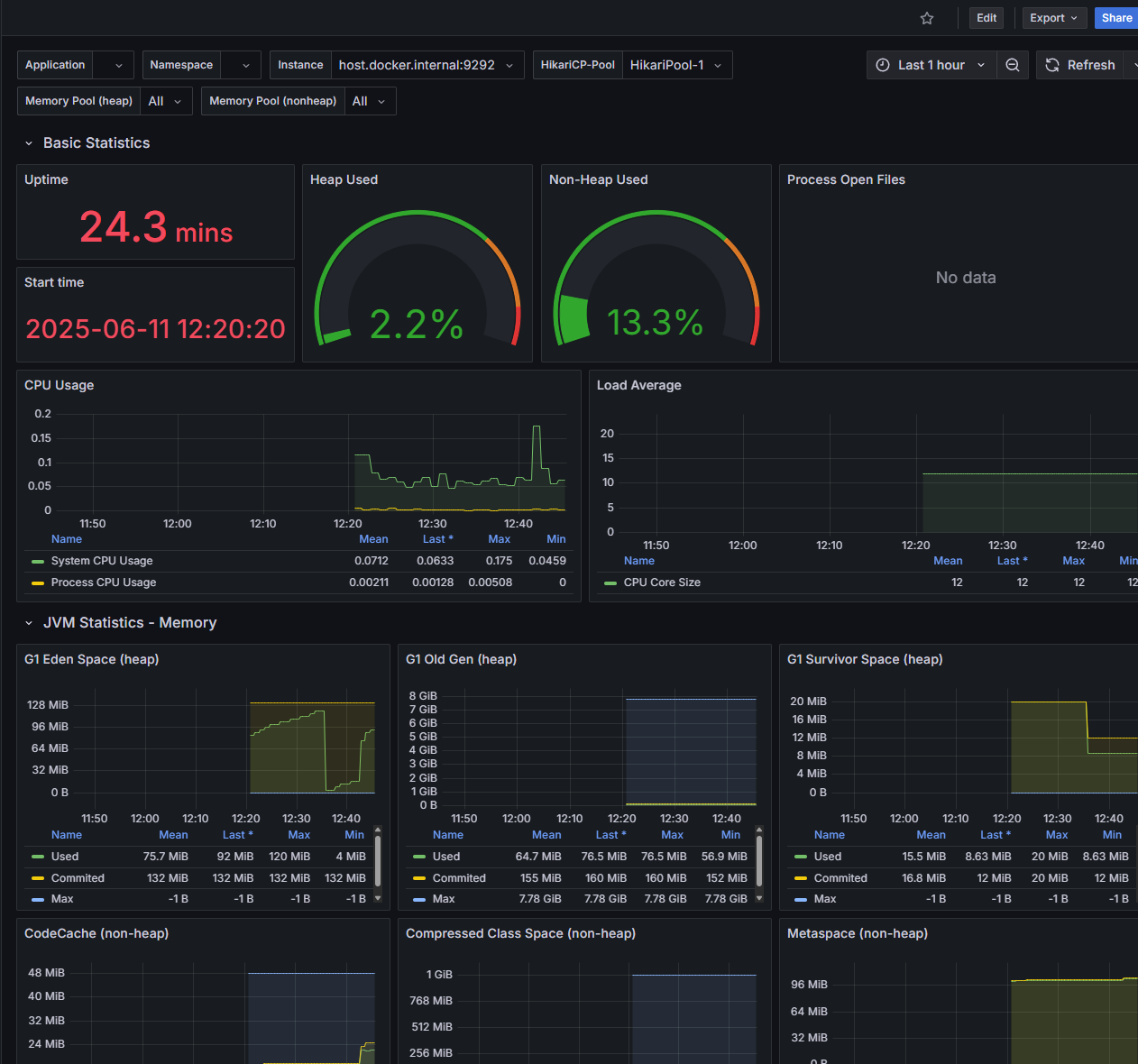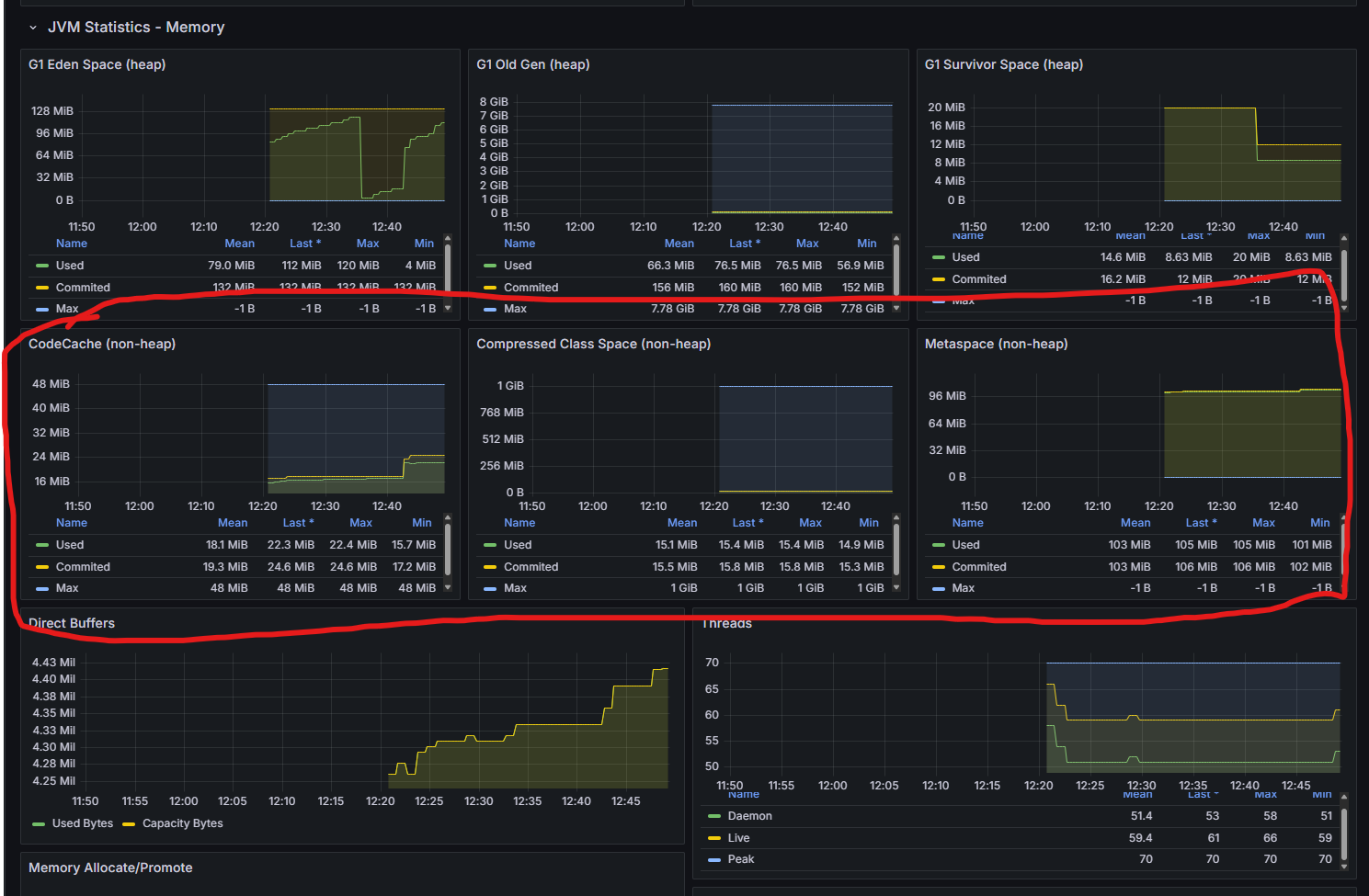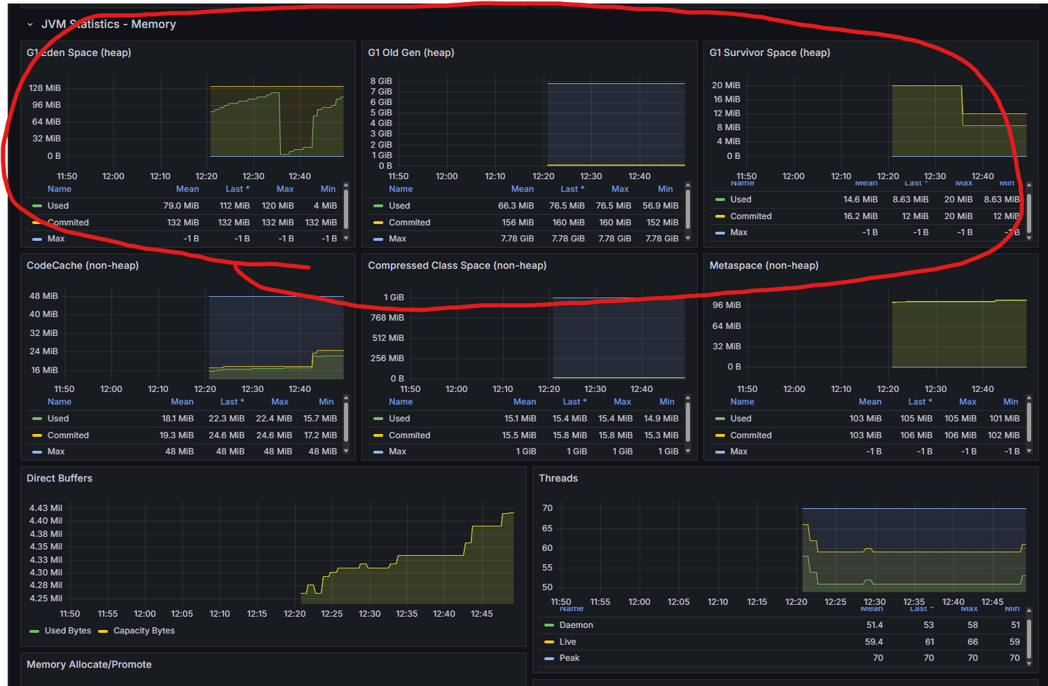 | G1 Old Gen (heap) | 오래 살아남은 객체들이 저장되는 공간. 이 영역이 계속 커지면 Full GC 가능성이 높아진다 |