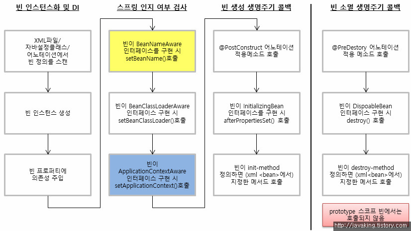 💡 Bean의 Life Cycle이란 해당 객체가 언제, 어떻게 생성되어 소멸되기 전까지 어떤 작업을 수행하고 언제, 어떻게 소멸되는지 일련의 과정을 이르는 말