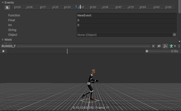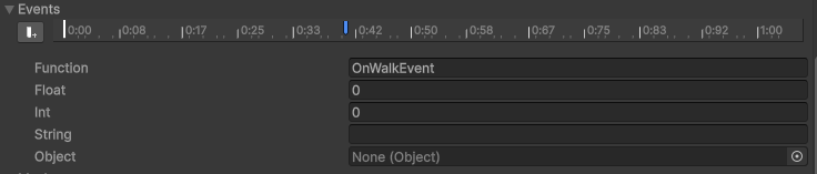 위와 같은 화면에서 시간이 적혀있는 바로 아래줄이 애니메이션 이벤트 줄이고 이곳을 우클릭하여 애니메이션 이벤트를 추가, 삭제 할 수있다.