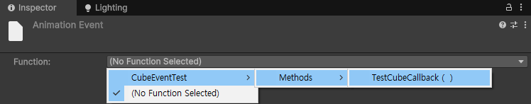 함수를 지정할 수 있는 것이 있는데 이때 함수로 지정가능한 것은 Animator 컴포넌트가 있는 해당 게임 오브젝트에서 Animator을 제외한 컴포넌트의 함수만 호출할 수 있다.