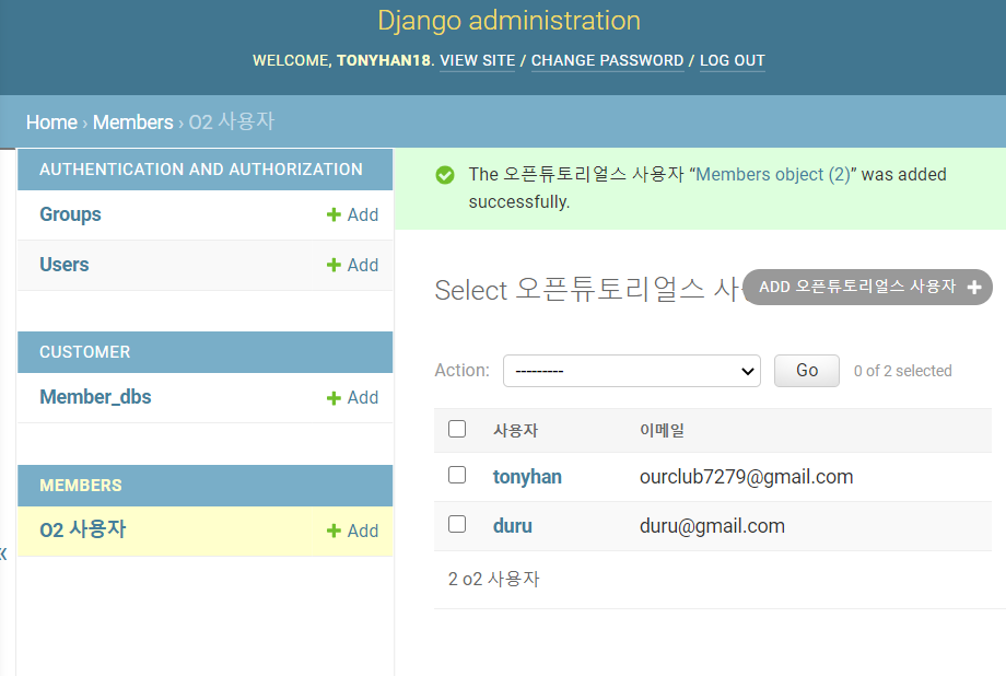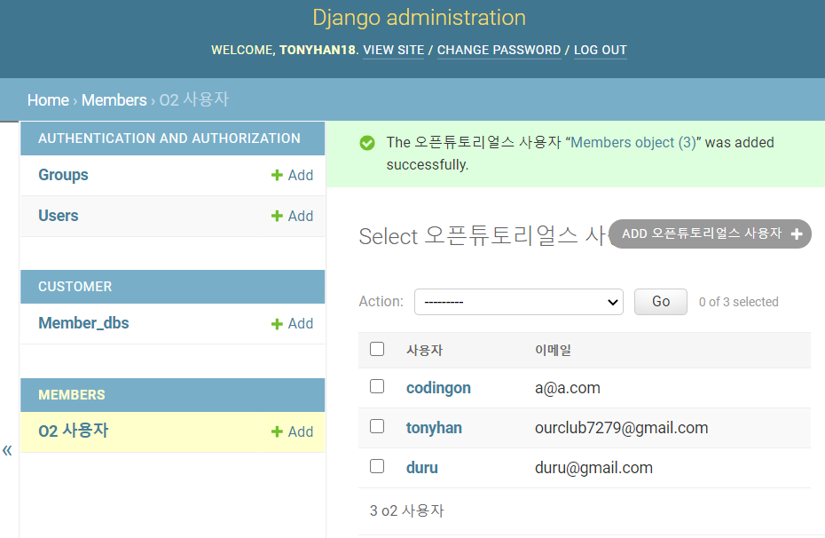 먼저 admin 페이지에 들어가서 새로운 유저를 삽입하자