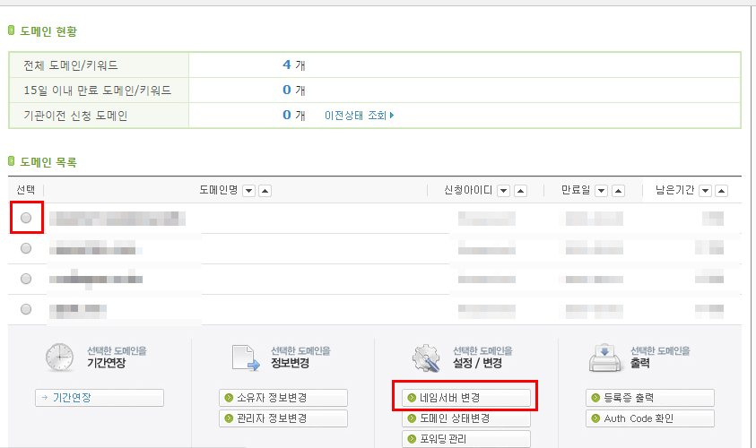 구입한 도메인을 선택하고 네임서버 변경을 클릭