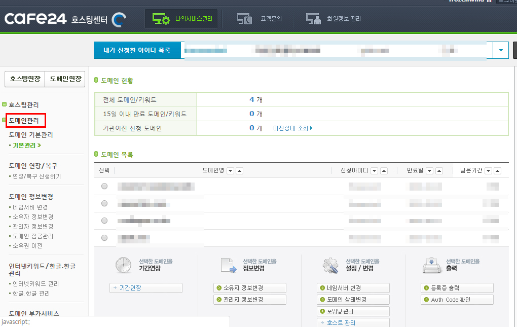 cafe24에서 나의서비스관리, 도메인관리를 차례로 입력