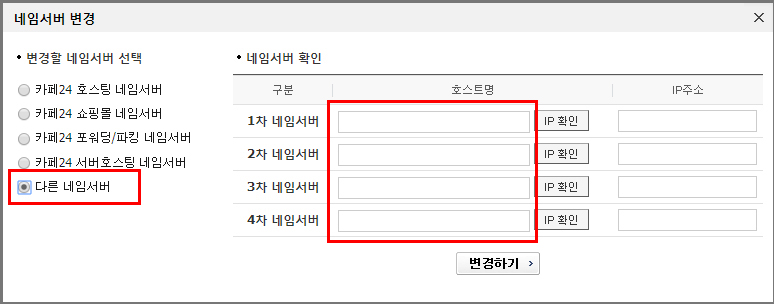 네임서버 변경 팝업창이 나오면 왼쪽의 메뉴에서 다른 네임서버를 선택한뒤, 아까 네이버 클라우드 플랫폼에서 제공했던 DNS 정보를 입력