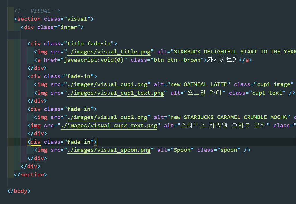 이번에는 이미지가 점진적으로 사라지는 것을 구현해보자. 이르 위해 이미지를 감사고 있는 클래스들에 fade-in 클래스를 입력해주자.
