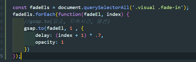다시금 gsap을 사용하는데 애니메이션이 순차적으로 실행될 수 있도록 delay값도 인덱스에 함께 넣어주자.