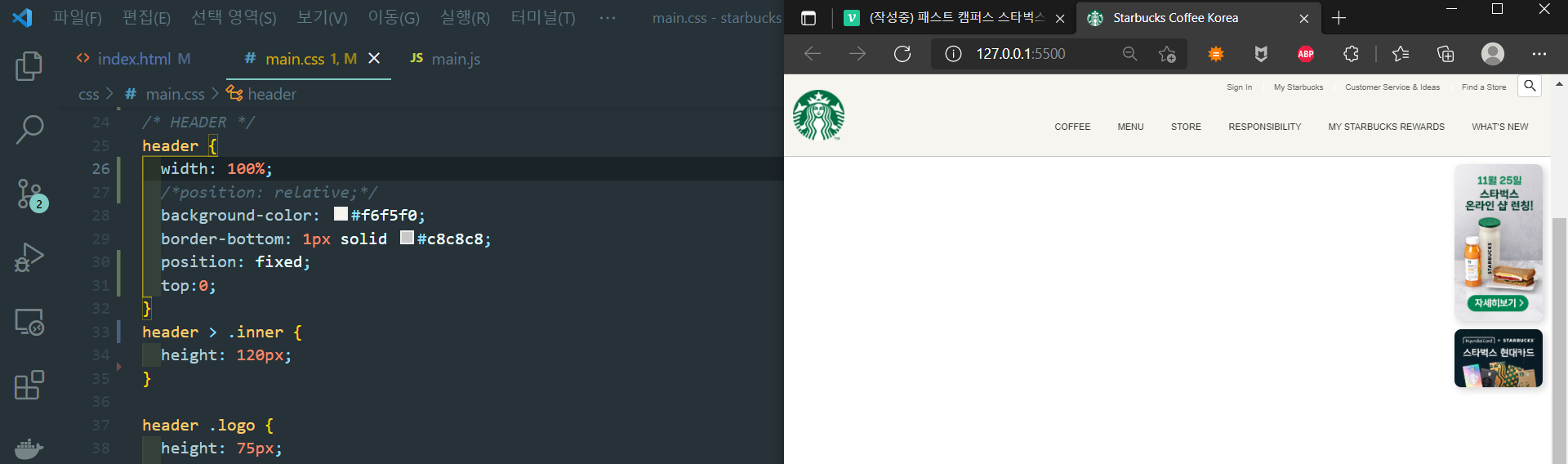 이제 헤더가 화면의 상단에 항상 붙어 있을 수 있도록 바꾸어주자.
