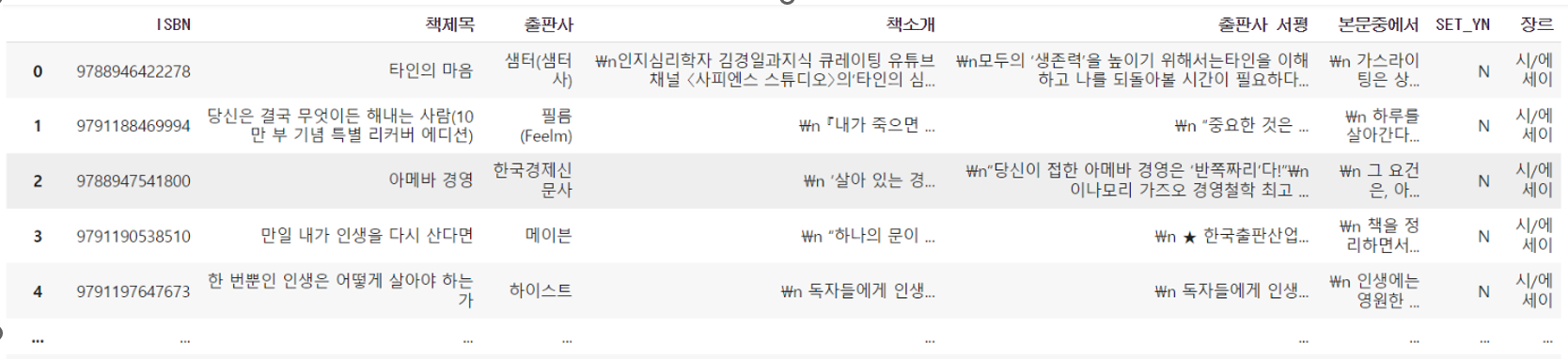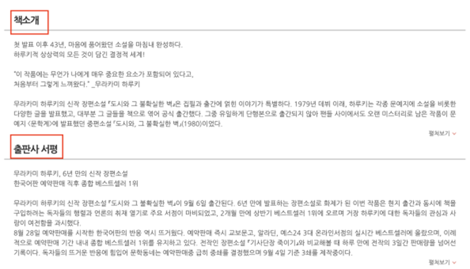 책 표지(이미지), 제목, 책소개, 본문중에서, 출판사 서평(후에 삭제) 값들을 크롤링했다.