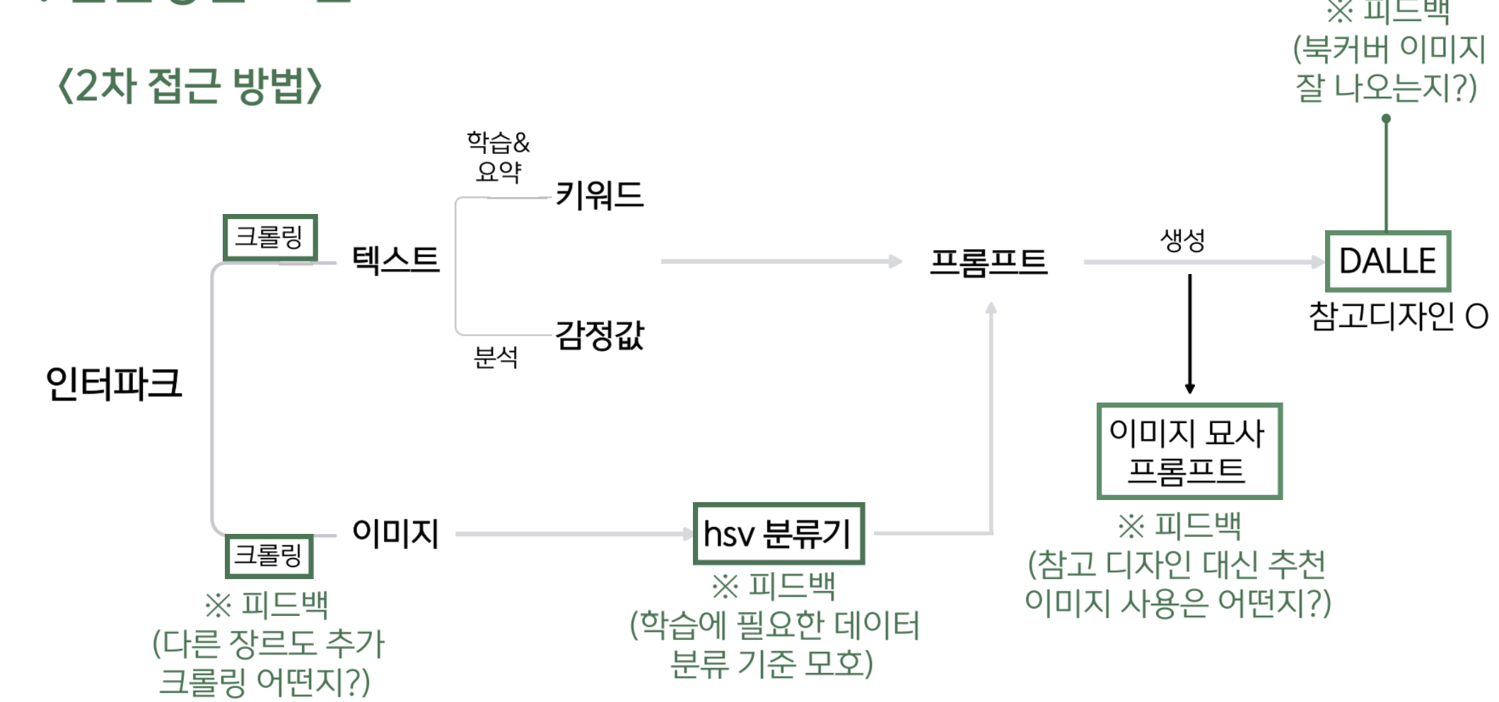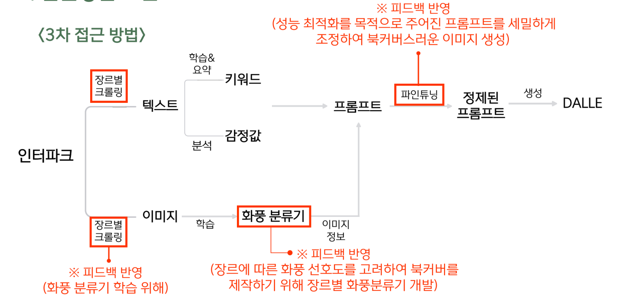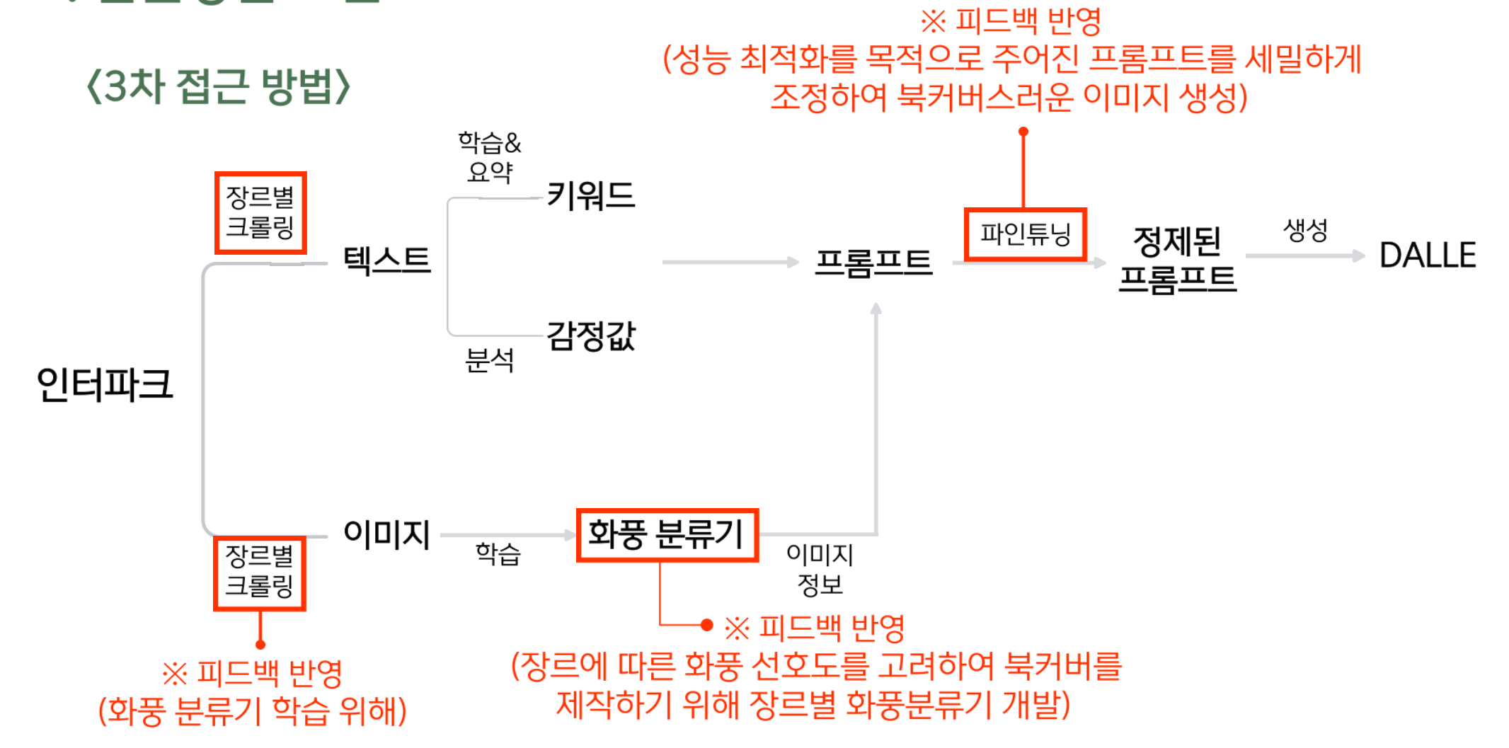 피드백 이후 흐름도. 화풍 분류기는 결국 포기하였고... DALLE는 자체적으로 파인튜닝을 제공하지 않기 때문에 이 부분도 막혔다.