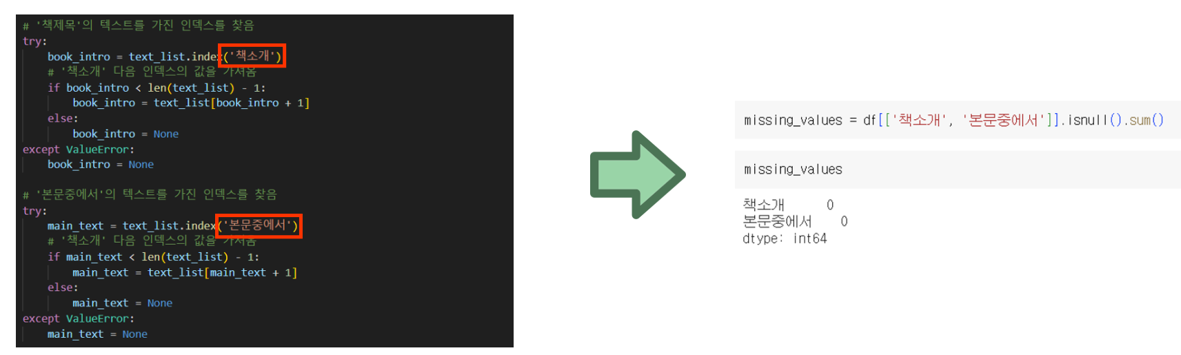 책 소개, 본문중에서 등 해당 값들이 존재하지 않는 책도 있었다. 예외 설정을 해주어 일관된 값만 긁어오도록 해주었다.