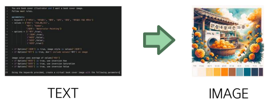 인터파크 도서 사이트에서 텍스트 데이터와 이미지 데이터를 각각 크롤링 한 후, 학습과 요약을 거쳐 본문 내용을 충분히 포함하는 키워드(5~10개)로 요약하고, 해당 키워드를 DALLE라는 생성형 이미지 인공지능에 넣어 이미지를 만들어내는 구상을 세웠었다.