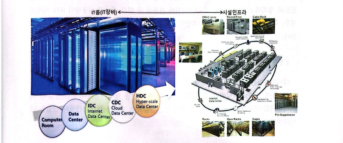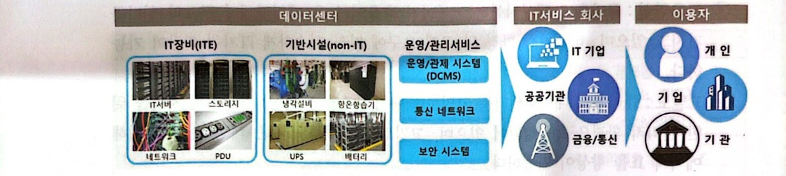 데이터센터는 크게 <1>IT(ITE : IT Equipment), <2>인프라설비(Non-IT) 및 <3>운영관리 서비스 의 3개의 요소로 구성된다. 또한, 서비 ㅡ형태 및 시설에 따라 세분화된 구성요소가 존재한다. IT장비는 서버, 스토리지, 네트워크 장비 등이고 IT장비의 안정적인 운영환경을 구현하는 인프라설비에는 항온항습기, 냉동기, 무정전전원장치(UPS : Uninterruptible Power Supply), 배터리 및 발전기가 해당된다. 그리고 이러한 장비와 시설을 효율적으로 운영 관리하는 서비스인 DCMS(Data Center Management System)가 포함된다. 데이터센터 구성 및 서비스 체계는 다음과 같다.