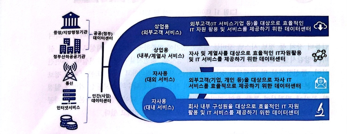 데이터센터는 운영주체와 서비스 형태에 따라서 다양한 유형으로 구분된다. 첫째, 데이터센터의 운영 주체별 분류는 정부/공공 데이터센터와 민간(산업계) 데이터센터 구분된다. 둘째, 서비스 형태별로 분류하면 자사용 데이터센터와 상업용 데이터센터로 구분된다.