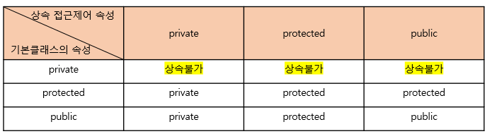 - 어떠한 방식으로 상속 받더라도 파생 클래스는 기본 클래스의 private 멤버를 접근할 수 없다.