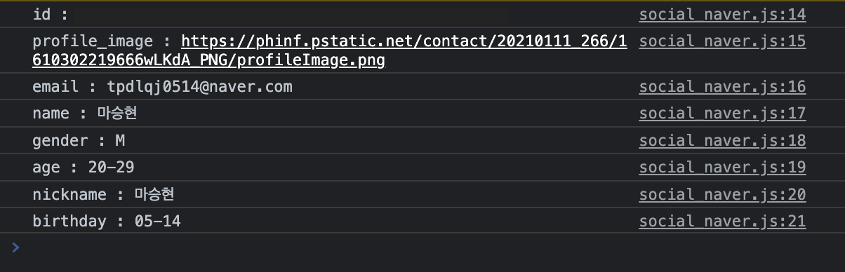 var naver_id_login = new naver_id_login("[발급 받은 Client KEY]", "http://127.0.0.1:3000/login.html"); var state = naver_id_login.getUniqState(); // naver_id_login.setButton("white", 5,40); naver_id_login.setDomain("http://127.0.0.1:3000"); naver_id_login.setState(state); // naver_id_login.setPopup(); naver_id_login.init_naver_id_login(); naver_id_login.get_naver_userprofile("naverSignInCallback()") function naverSignInCallback() { console.log('id : ' + naver_id_login.getProfileData('id')); console.log("profile_image : " + naver_id_login.getProfileData('profile_image')); console.log("email : " + naver_id_login.getProfileData('email')); console.log("name : " + naver_id_login.getProfileData('name')); console.log("gender : " + naver_id_login.getProfileData('gender')); console.log("age : " + naver_id_login.getProfileData('age')); console.log("nickname : " + naver_id_login.getProfileData('nickname')); console.log("birthday : " + naver_id_login.getProfileData('birthday')); }