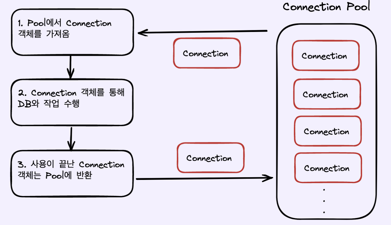 - 이러한 상황을 예방하기 위해 미리 일정 갯수의 Connection을 만들어 Pool에 저장을 하고, 사용자의 요청이 발생하면 Connection을 제공하고 사용자와의 연결이 종료된다면 Pool에 다시 반환하여 보관하는 것을 의미한다.