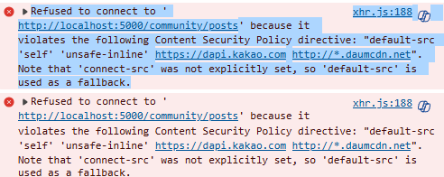 connect-src 디렉티브가 CSP 설정에서 명시적으로 설정되지 않아서, 기본적으로 default-src가 적용되고 있습니다.