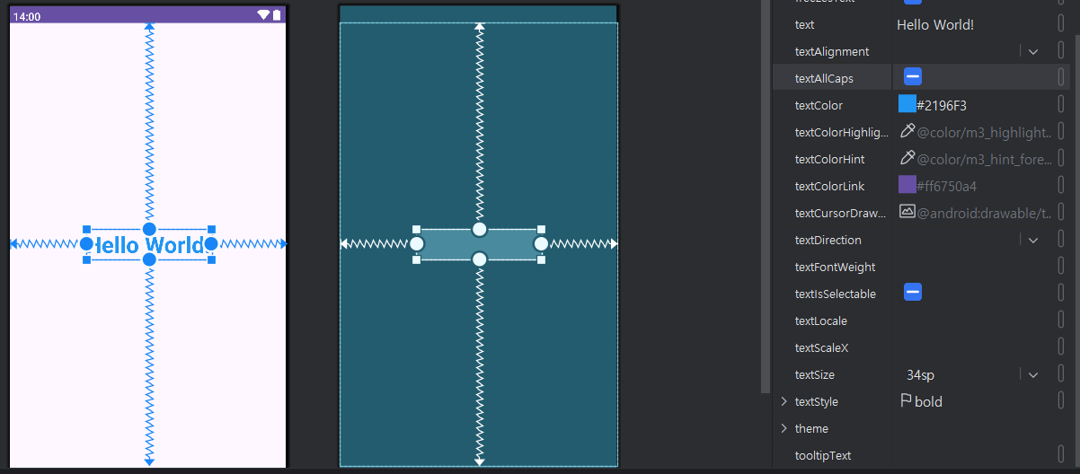 textColor -> 글자 색깔 변경 가능 textSize -> 34sp 글자 크기 변경 ( 안드로이드에서는 sp 써줘야함 ) textStyle -> 글자 스타일 설정 가능 ex) bold 볼드체 설정