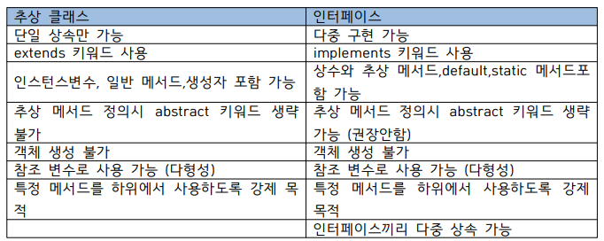 - 추상 메서드를 가지고 있기 때문에 객체생성이 불가능하다. 추상 클래스와 마찬가지로 인터페이스를 사용하기 위해서는 일반 클래스를 이용한다. 상속과 비슷한 구현(implement)을 이용하고 다형성 적용도 가능하다. 구현할 때는