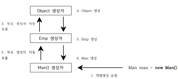 --> 하위 클래스인 Man 의 생성자 첫 라인에서 명시적으로 하나의 문자열을 저장할 수 있는 부모 생성자를 super키워드를 이용하여 호출한다. 부모 생성자는 상속이 안되기 때문에 super([값])을 통한 방법으로만 호출이 가능하다.