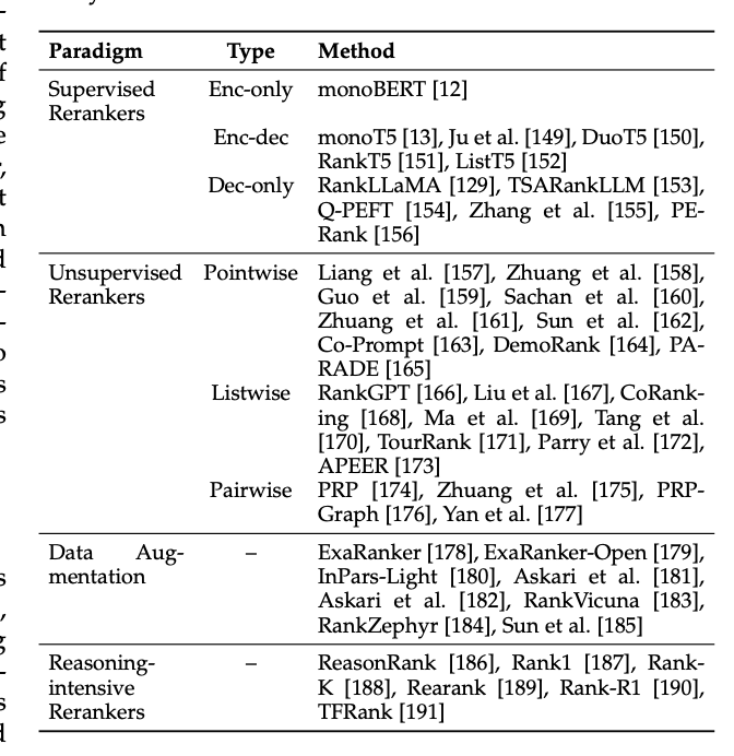 LLM을 사용하는 방식에 따라, 기존의 LLM 기반 reranking 방법들은 네 가지 방식으로 나뉜다.