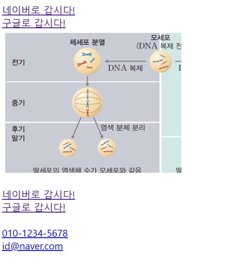 : 링크는 anchor, a 태그 요소는 href 속성을 통해 다른 페이지, 전화번호, 이메일 주소와 그 외 다른 url로 연결할 수 있는 링크(연결)를 만듦