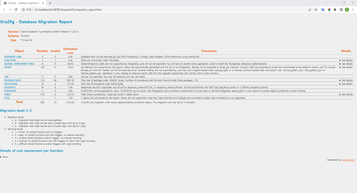 # ora2pg -t SHOW_REPORT -c $HOME/migration_project/config/ora2pg.conf --estimate_cost --dump_as_html > $HOME/migration_report.html
