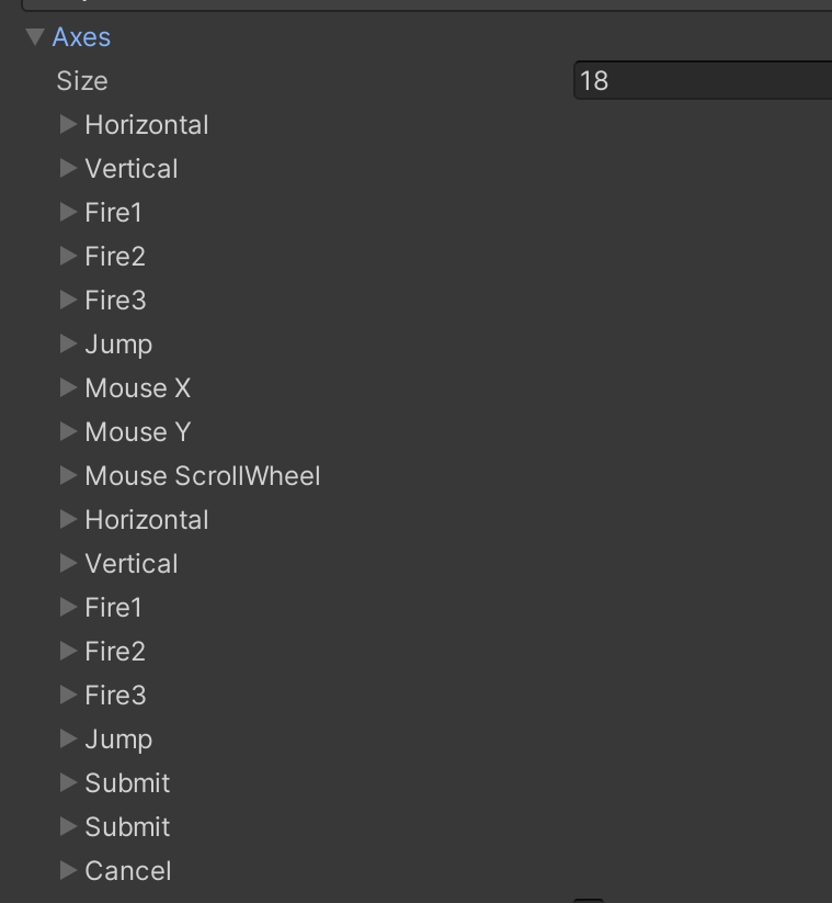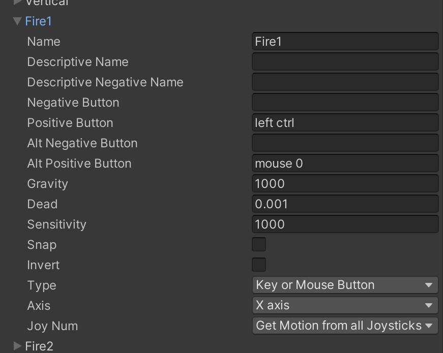 Fire1 : 키보드(Left ctrl), 마우스(Left button), 조이스틱(Button0)으로 정의함GetButton