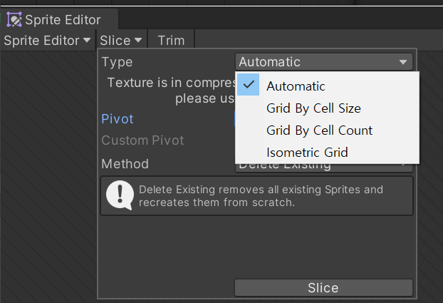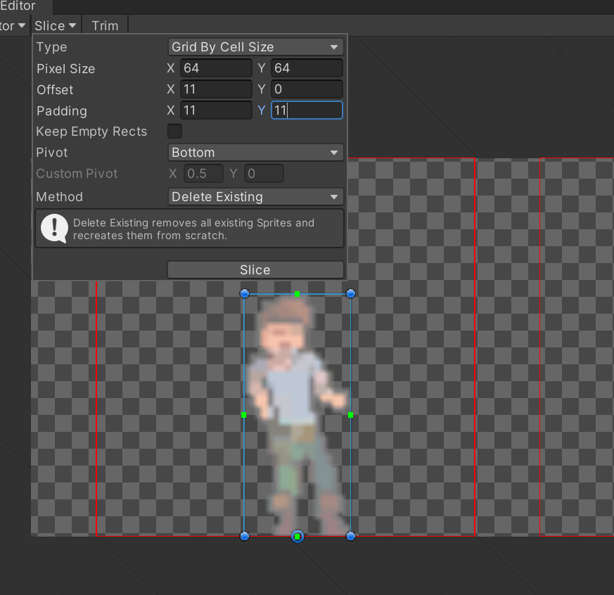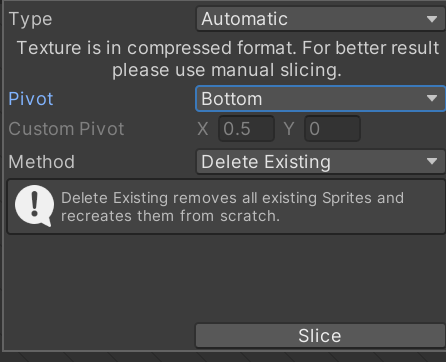 그다음 Slice를 누르면, 자동으로 그림의 크기에 맞게 잘라준다. 이는 Alpha값(투명도)를 기준으로 나누는 것이다