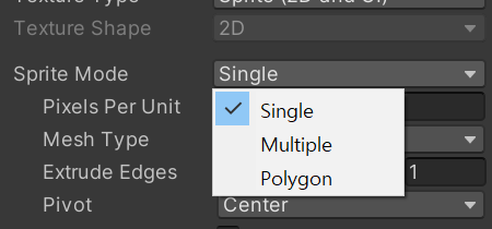 선택한 아틀라스와 같이 여러 이미지가 포함된 경우, Sprite Mode를 Multiple로 선택 해줘야 한다