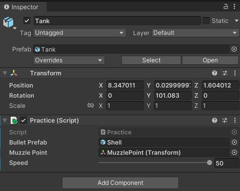 OutObject bulletOut1 = Instantiate(prefab, muzzlePoint.position, muzzlePoint.rotation);