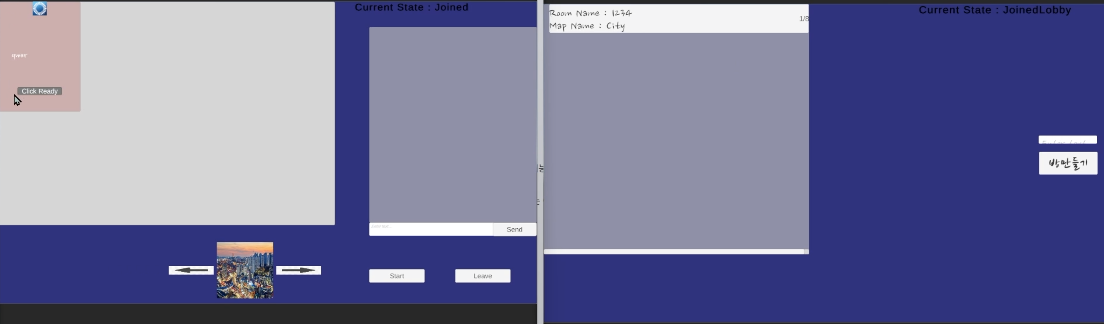 플레이해서 방을 생성하는 단계까지 진행 후, ParrelSync로 만든 클론 에디터로 방이 생성되었는지 확인한다.