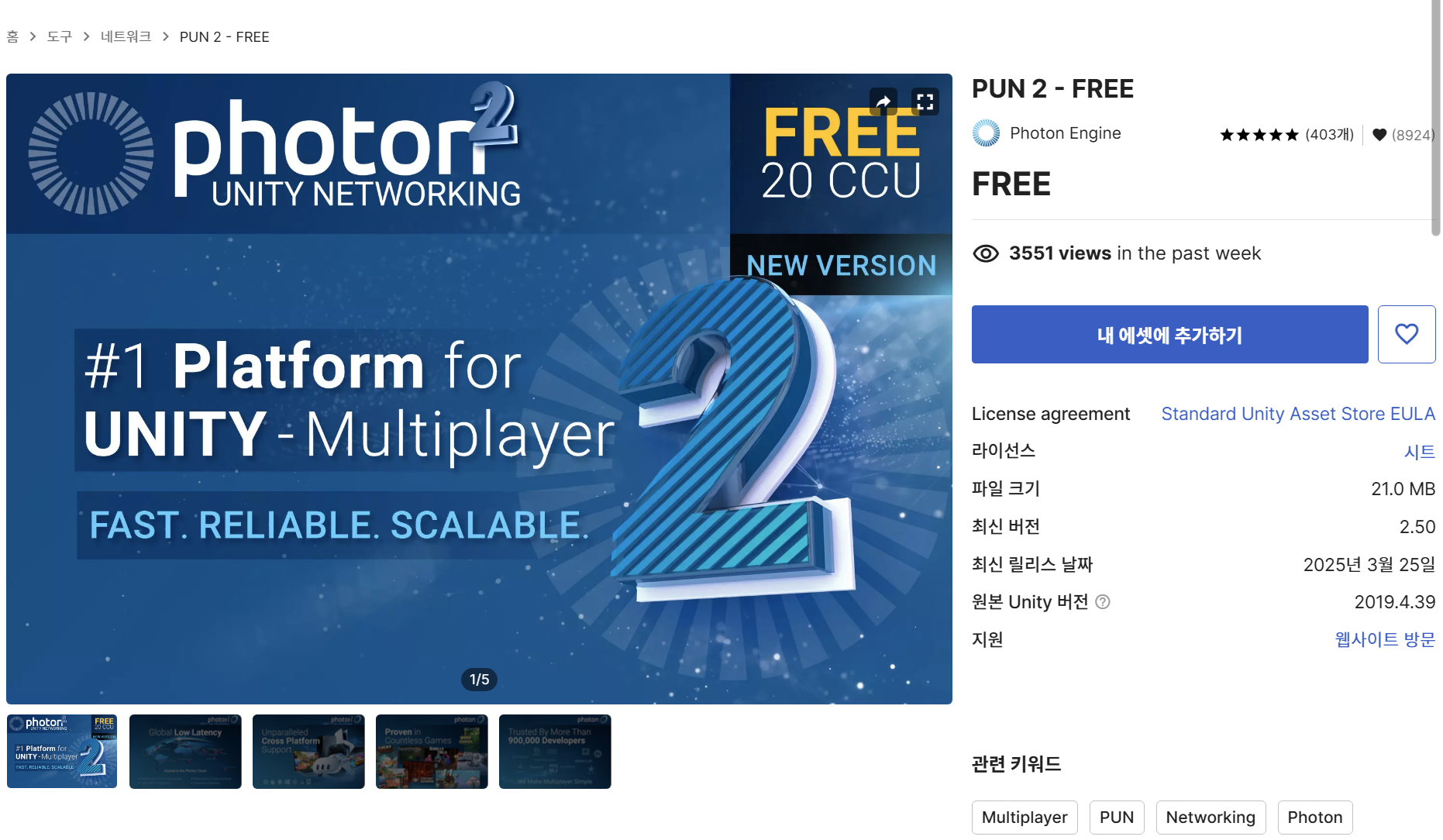 에셋 스토어에서 PUN2를 추가해줘야 한다. 추가한 이후, 유니티에서 패키지매니저로 추가할 수 있다.