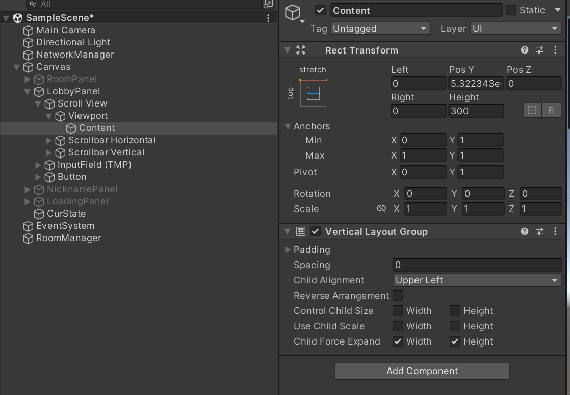 Content에 Vertical Layout Group을 추가해준다. 이를 통해, 룸 리스트 아이템이 추가될 때마다 자동으로 정렬되서 아래에 추가된다.
