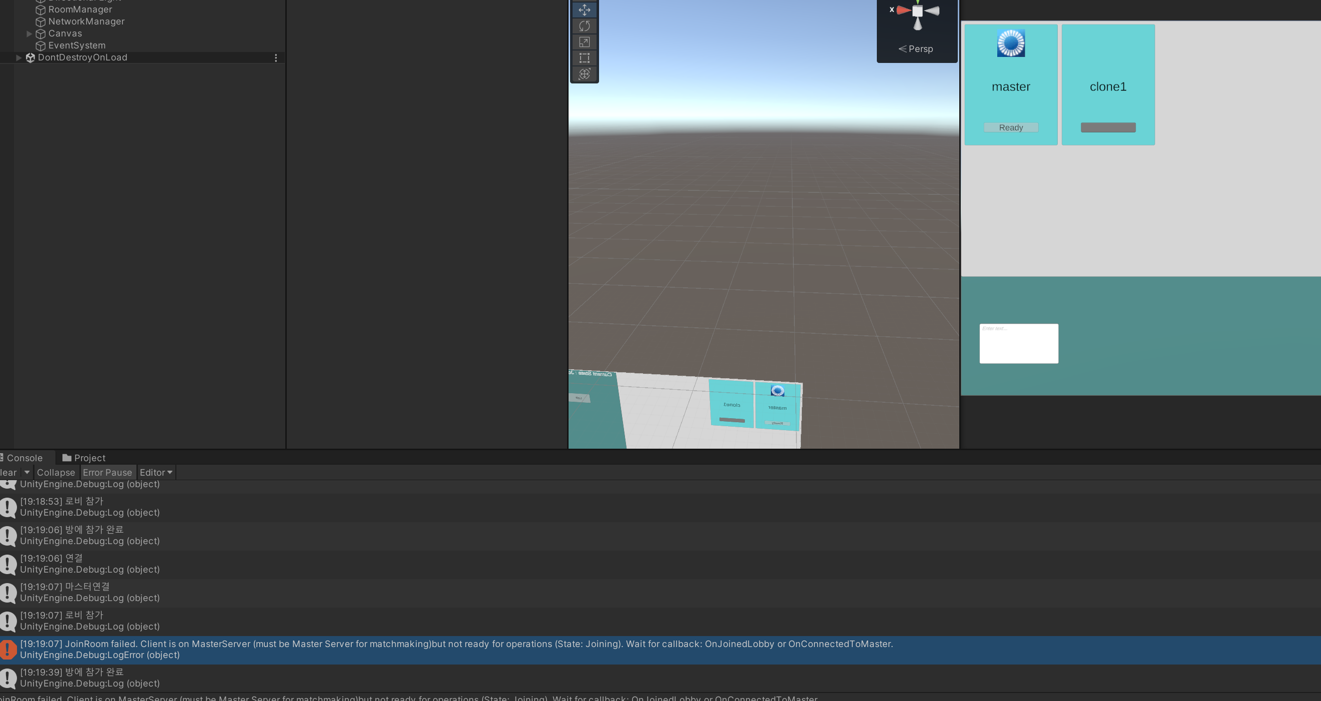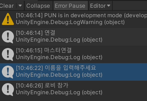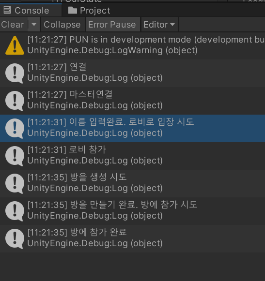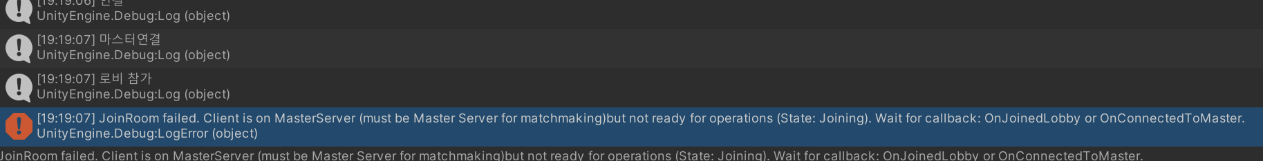 분명 방에 접속 전에는 상태가 JoinedLobby였는데, 왜 에러는 로비에 접속을 못했다고 하는 것인지 모르겠다. Joining이 로비에 대한 접속인 것 같다.