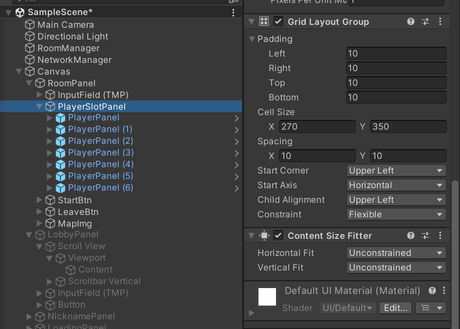 플레이어 슬롯이 추가되는 패널에는 Grid Layout Group을 추가한다.