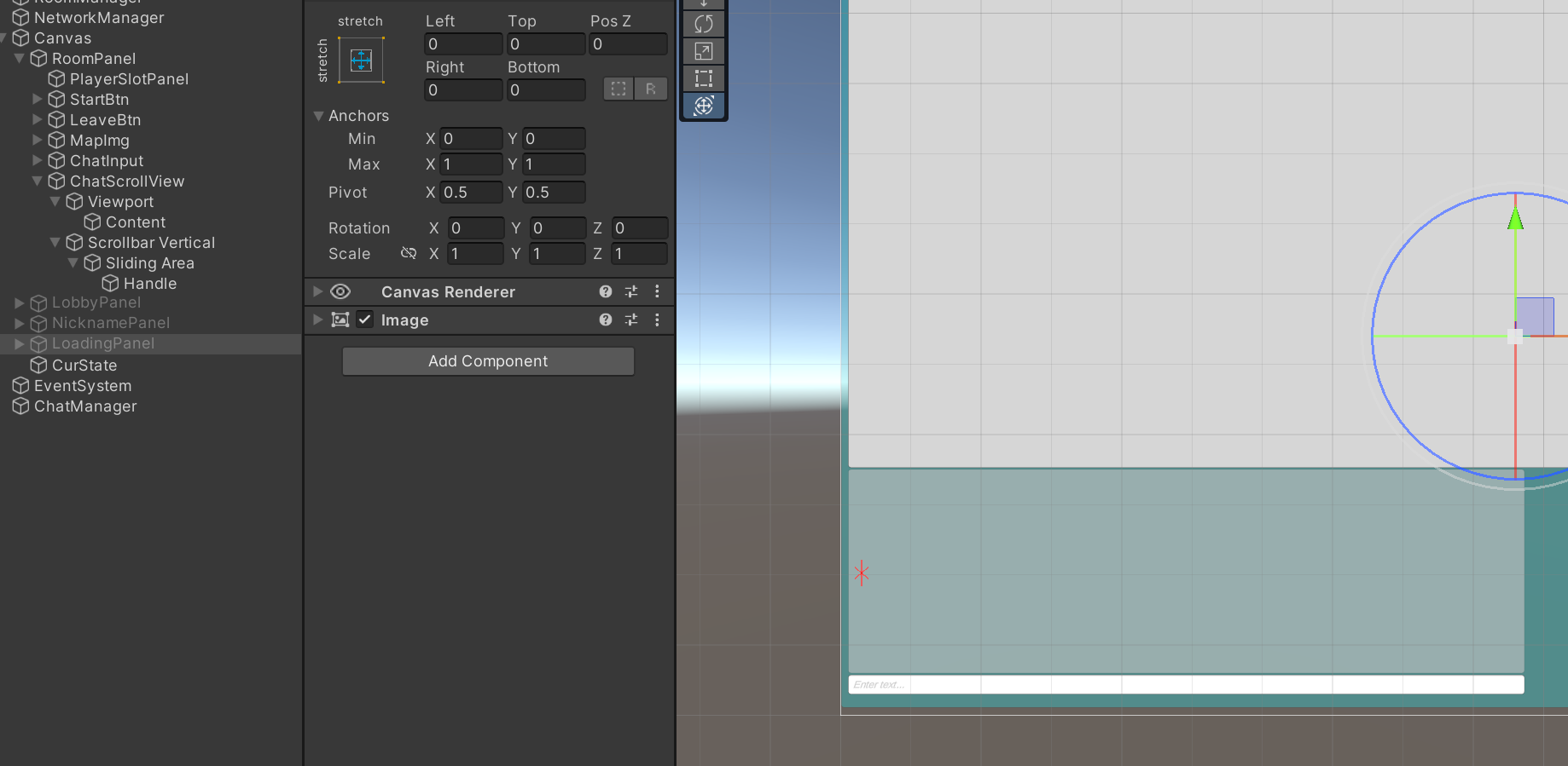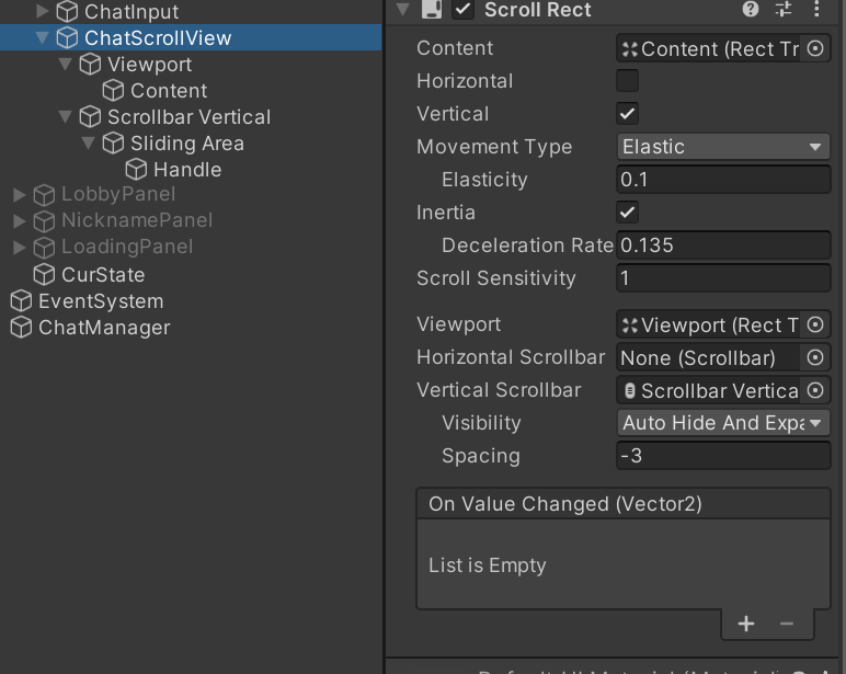 룸에서의 채팅을 관리하는 채팅 매니저 스크립트. 채팅 프리팹은 텍스트 UI 하나를 ScrollView의 Content안에 넣어서 만들어 준다.