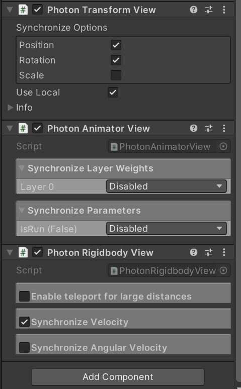 이번에는 직접 구현했지만, Transform과 Animation의 경우 위와 같은 컴포넌트들로 간단히 동기화 시킬 수 있다. 그래도 직접 구현하는 것이 더 다양한 커스텀이 가능하다. 스크립트를 참고만 하자.