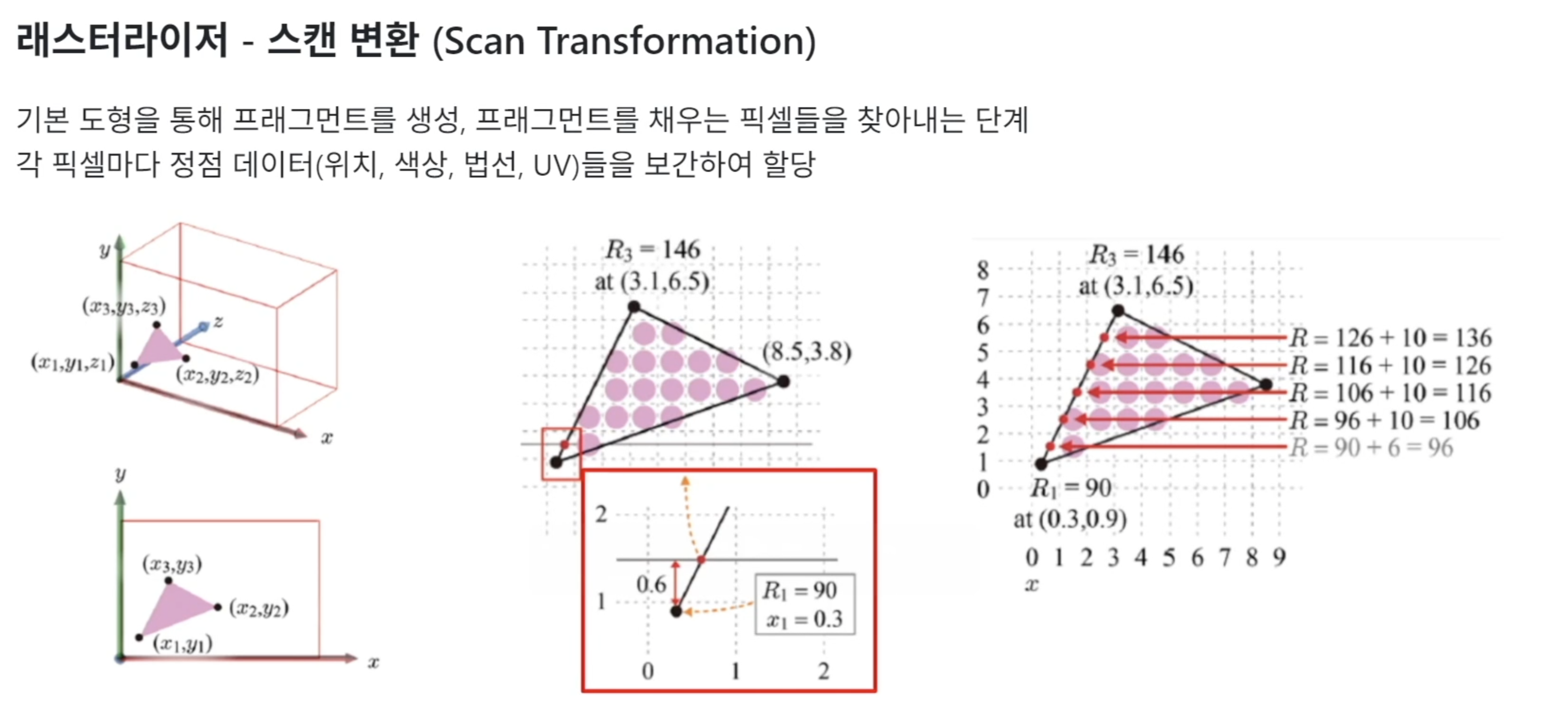 정점 데이터를 보간하여 할당하는 단계(안티엘리어싱,비등방성필터링 등의 알고리즘 기법들도 이곳에서 적용된다)
