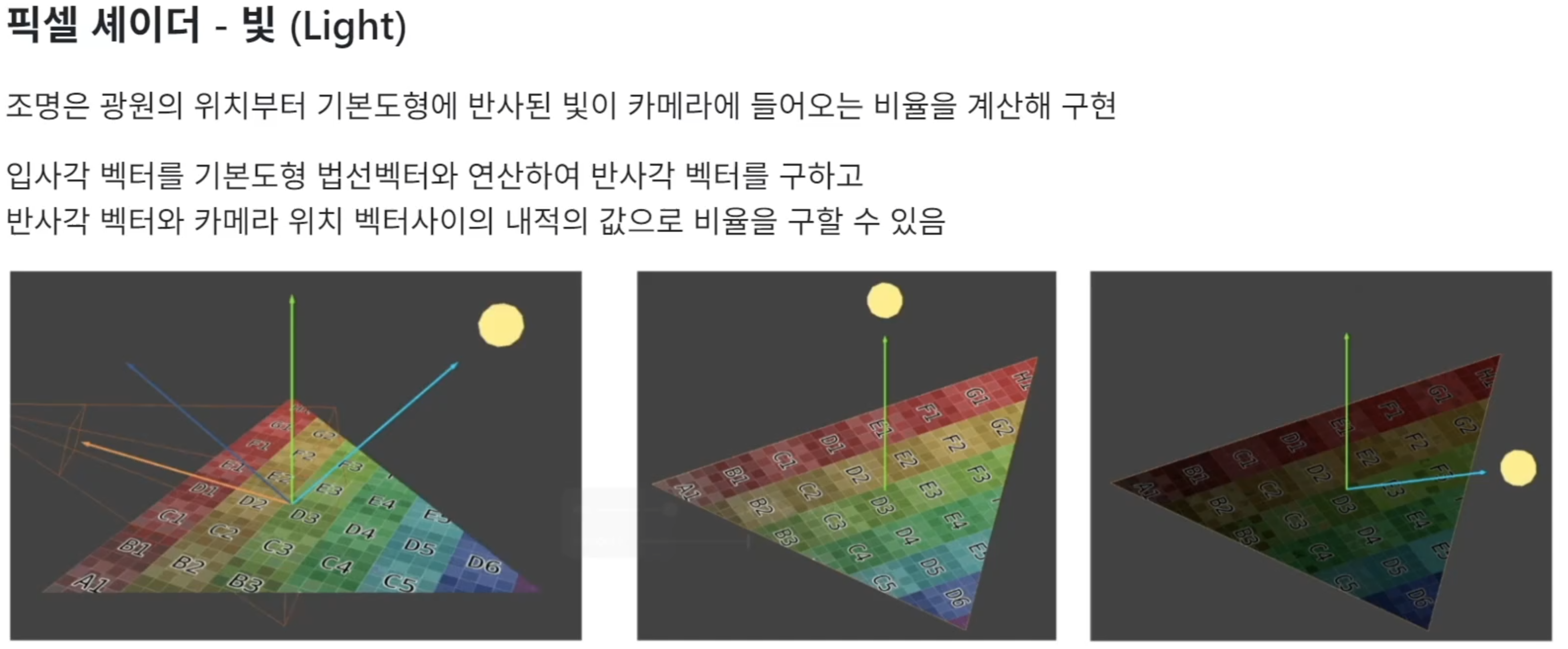 픽셀마다 픽셀 셰이더를 한 번씩 호출함. 깊이, 색상 값 을 계산하여 전달.