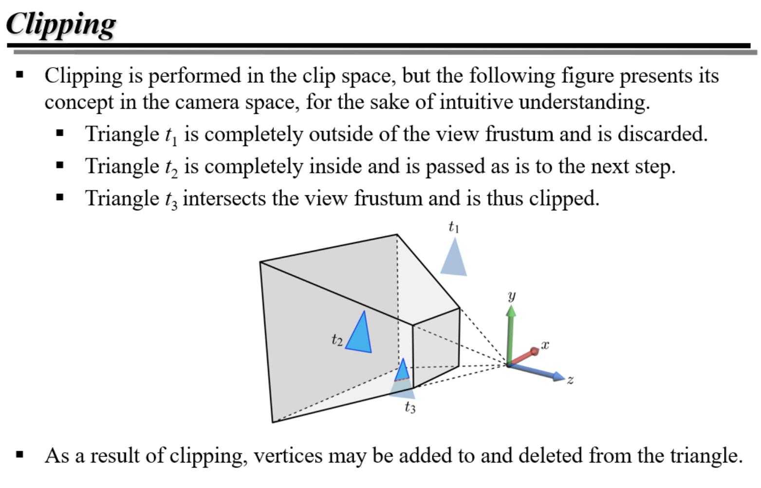 near clip, far clip.절두체(frustrum)이라고 함. 렌더링 안해도 되는 정보들을 솎아내는 작업