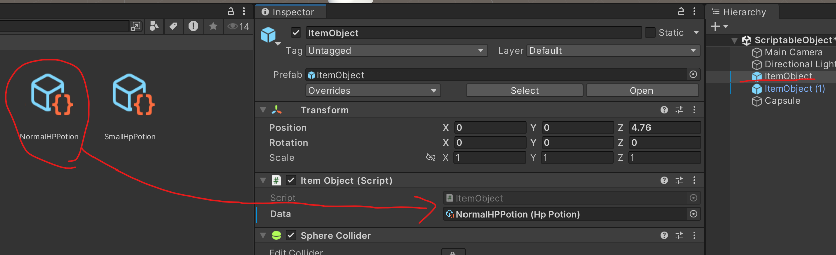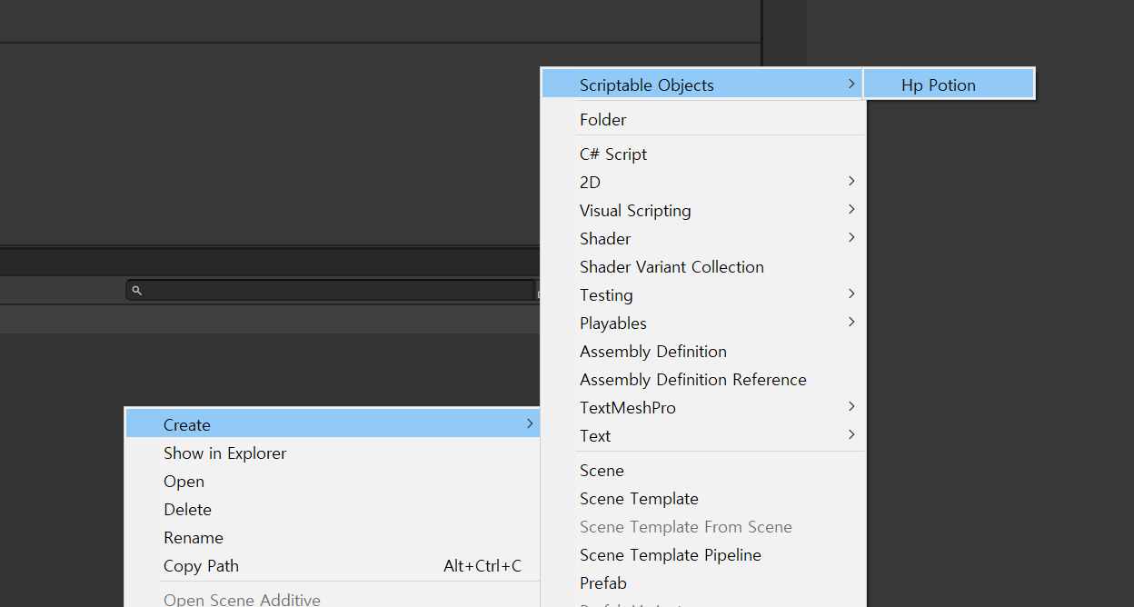 HP 포션을 주워서 인벤토리에 저장하고, 사용하면 체력을 회복할 수 있게 구현해보자스크립터블 오브젝트를 에디터 상에서 추가할 수 있게 만들어본다ScriptableObject를 상속받는 클래스를 작성한다스크립터블 오브젝트로 만들 수 있다public abstract class ItemData : ScriptableObject