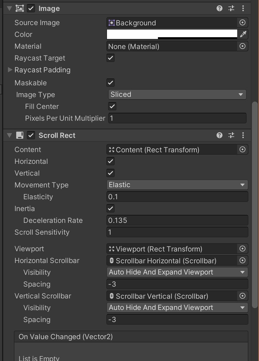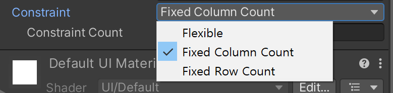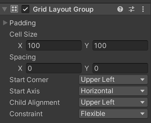 Cell Size : 자식들의 크기 조정Spacing : 자식들 간의 간격Padding : 자식들의 테두리를 기준으로 한 간격Start Corner : 정렬 시작 기준이 되는 자식Start Axis : 정렬 축Child Alignment : 패널 기준 위치를 정해준다Constraint : 행, 렬을 정해줄 수 있다. Flexible을 선택하면 유동적이다
