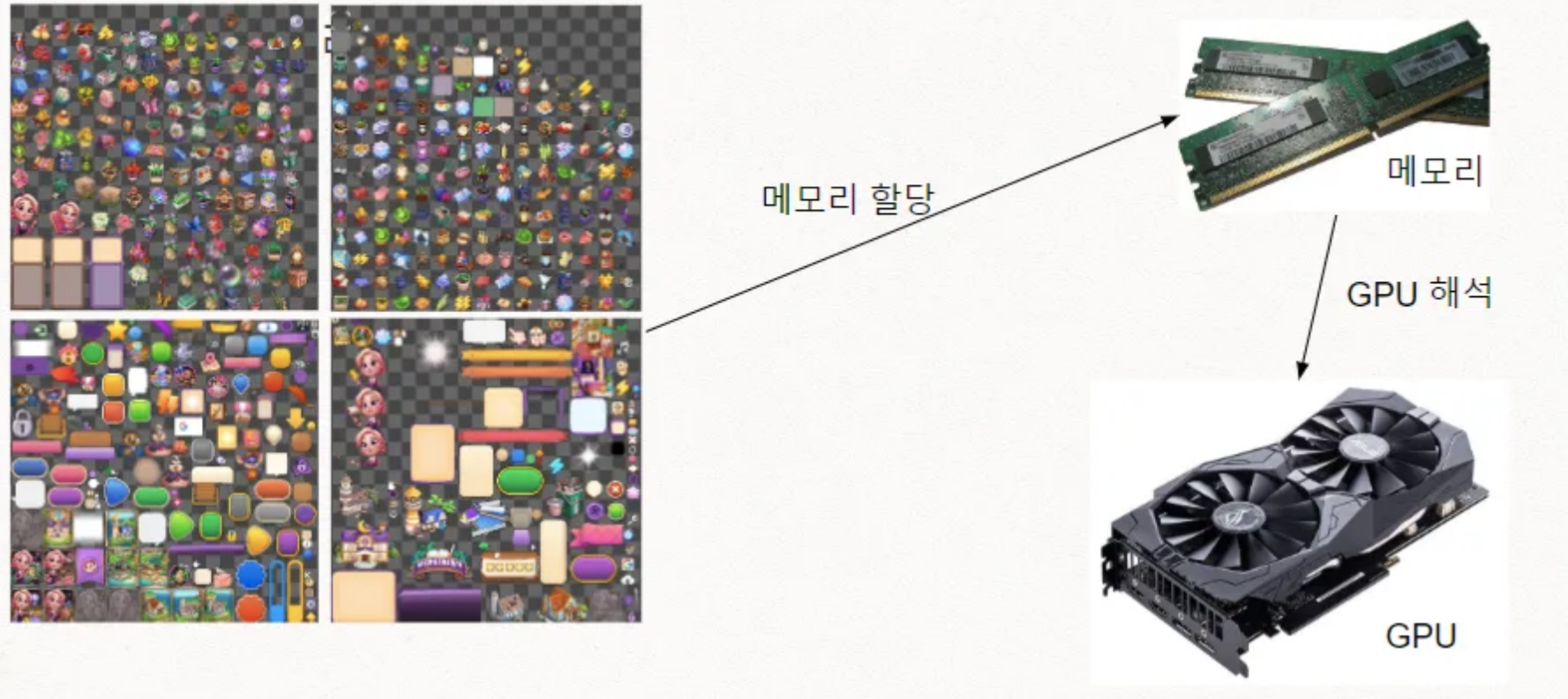 GPU 입장에서는 100개의 이미지 파일을 메모리로 가지고 있는 것보다, 큰 이미지 파일 하나에서 일부분을 그리도록 사용하는 방법이 더 빠르다. 캐쉬 친화도가 높아진다