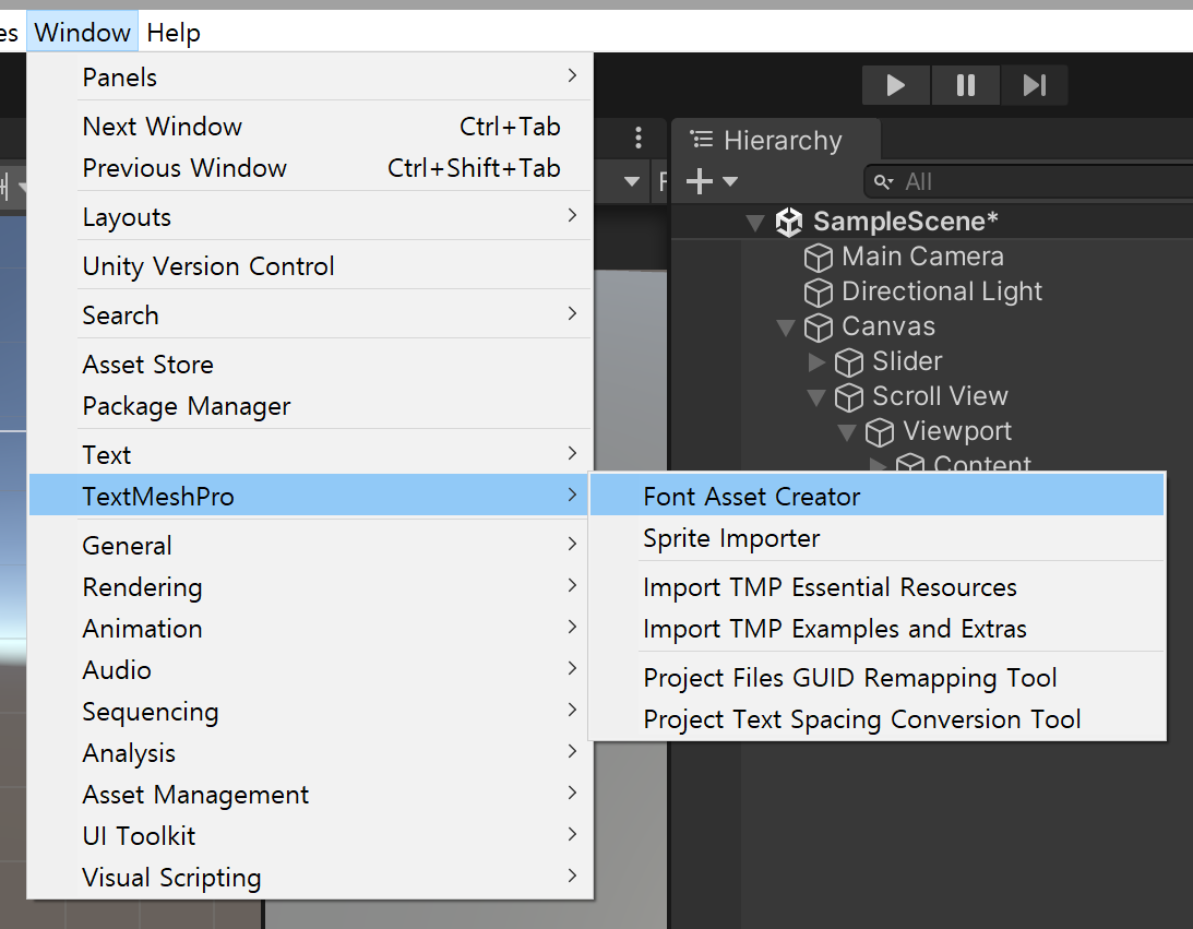 Content 안에 여러 요소들을 추가해서 이렇게 배치할 수 있다Font Asset Creator로 만든다. 사용할 폰트를 Asset 폴더에 넣고 Font Asset Creator로 폰트 에셋으로 만들어 준 후 사용하면 된다TMP는 Button, Scroll View 등 다른 UI들에도 쓰이므로 잘 알아보는 것이 좋다
