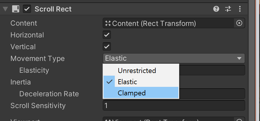 elastic 이면 스크롤에 탄성이 있다. 컨텐츠 끝보다 더 스크롤이 되지만, 손을 놓으면 다시 돌아간다. clamped는 그와 반대로 끝까지만 간다.Unrestricted 는 제한없이 스크롤이 된다